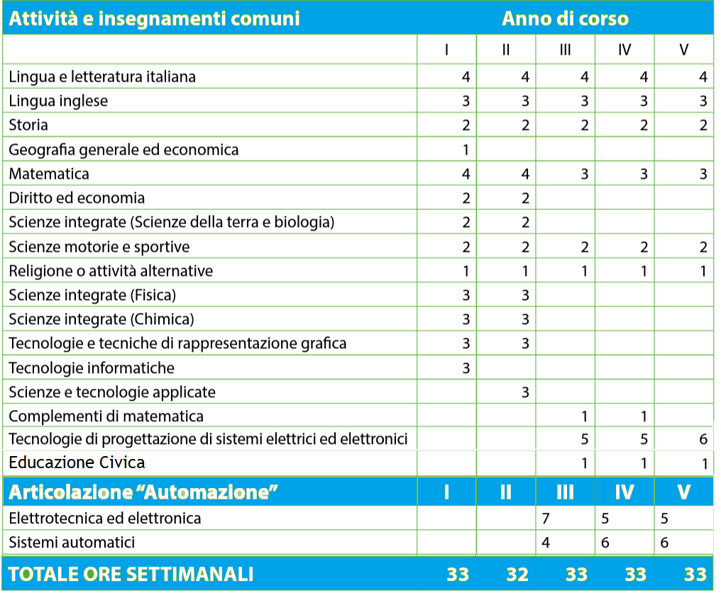 L'indirizzo Elettronica ed Elettrotecnica ha lo scopo generale di preparare lo studente nel campo della progettazione, costruzione e collaudo di impianti elettrici ed elettronici e di sistemi di automazione, partendo dalla conoscenza dei relativi materiali e tecnologie.